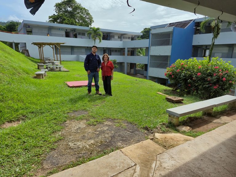 El Agrónomo Yehokhanan Lugo de Cafiesencia y la profesora Lilly Ortiz frente a la Escuela Laura Mercado